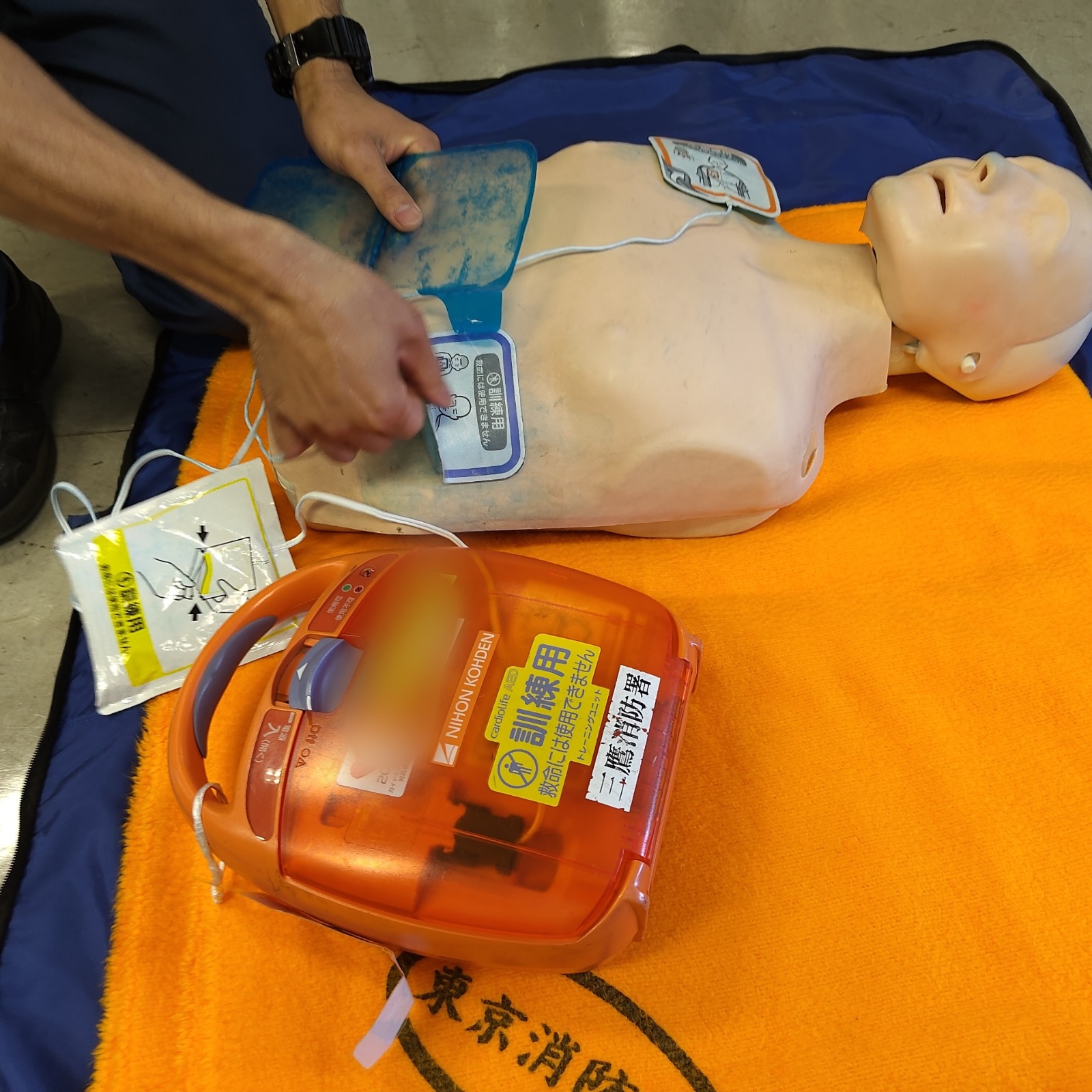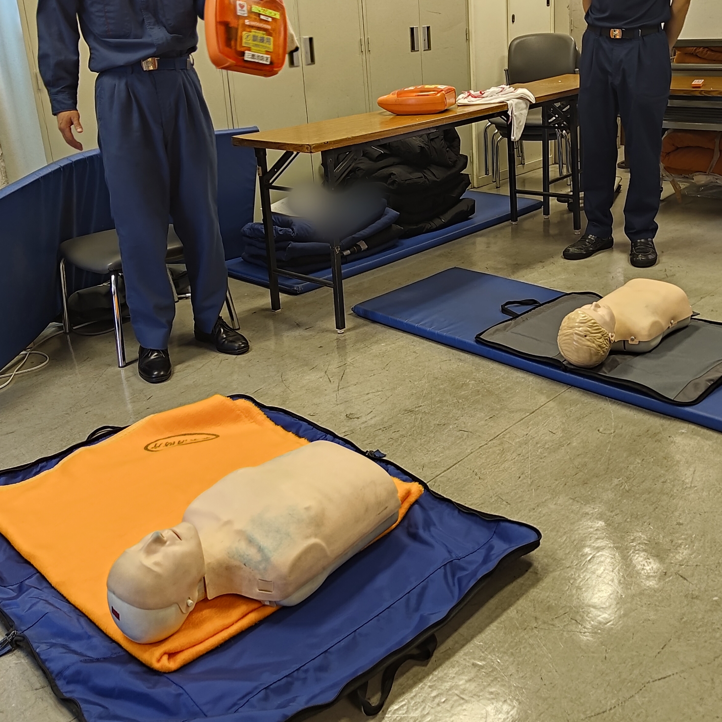 本日、職員研修の一環として、三鷹消防署下連雀出張所にて、消防隊員の皆様のご指導のもと、消火器の使用訓練およびAED(自動体外式除細動器)訓練を行いました。