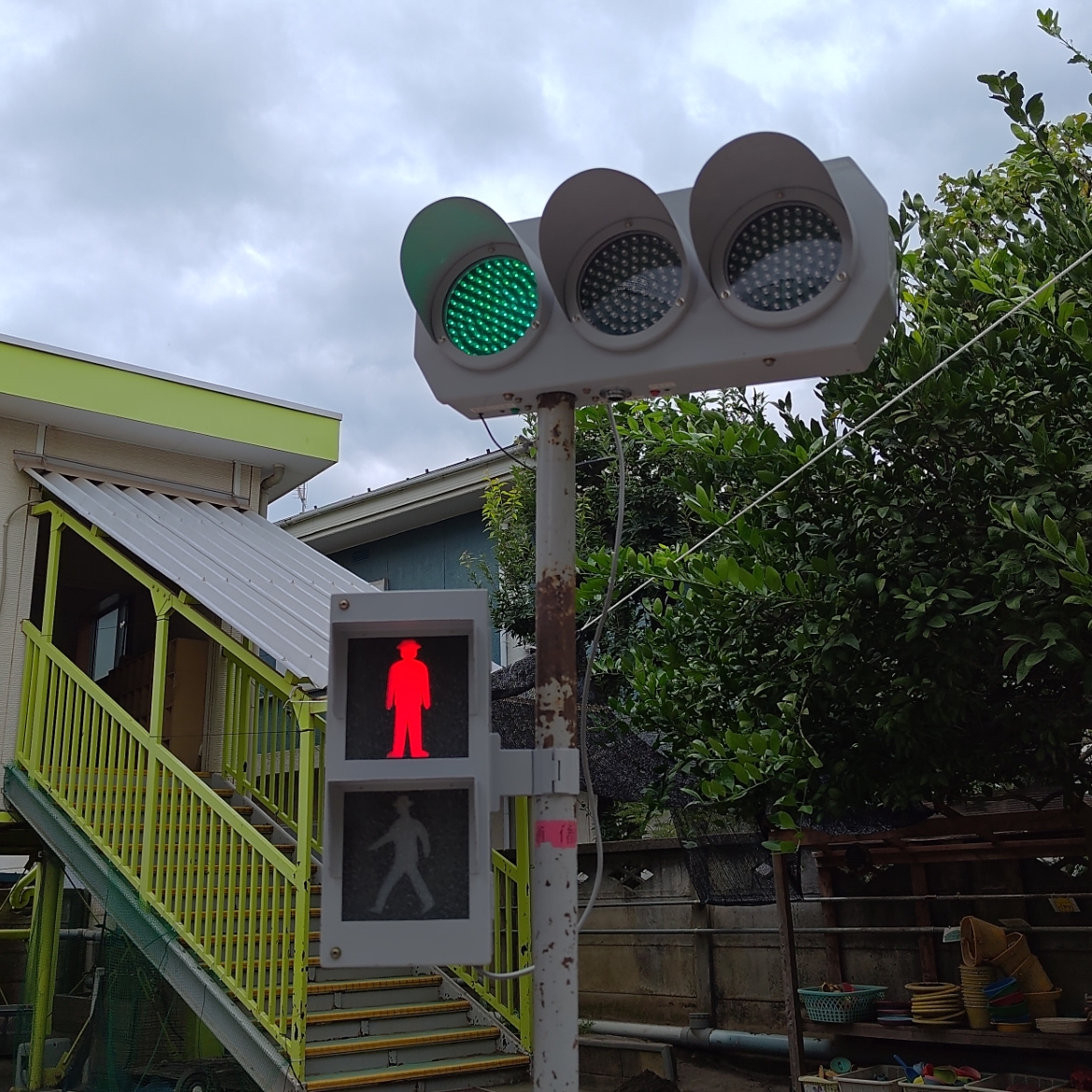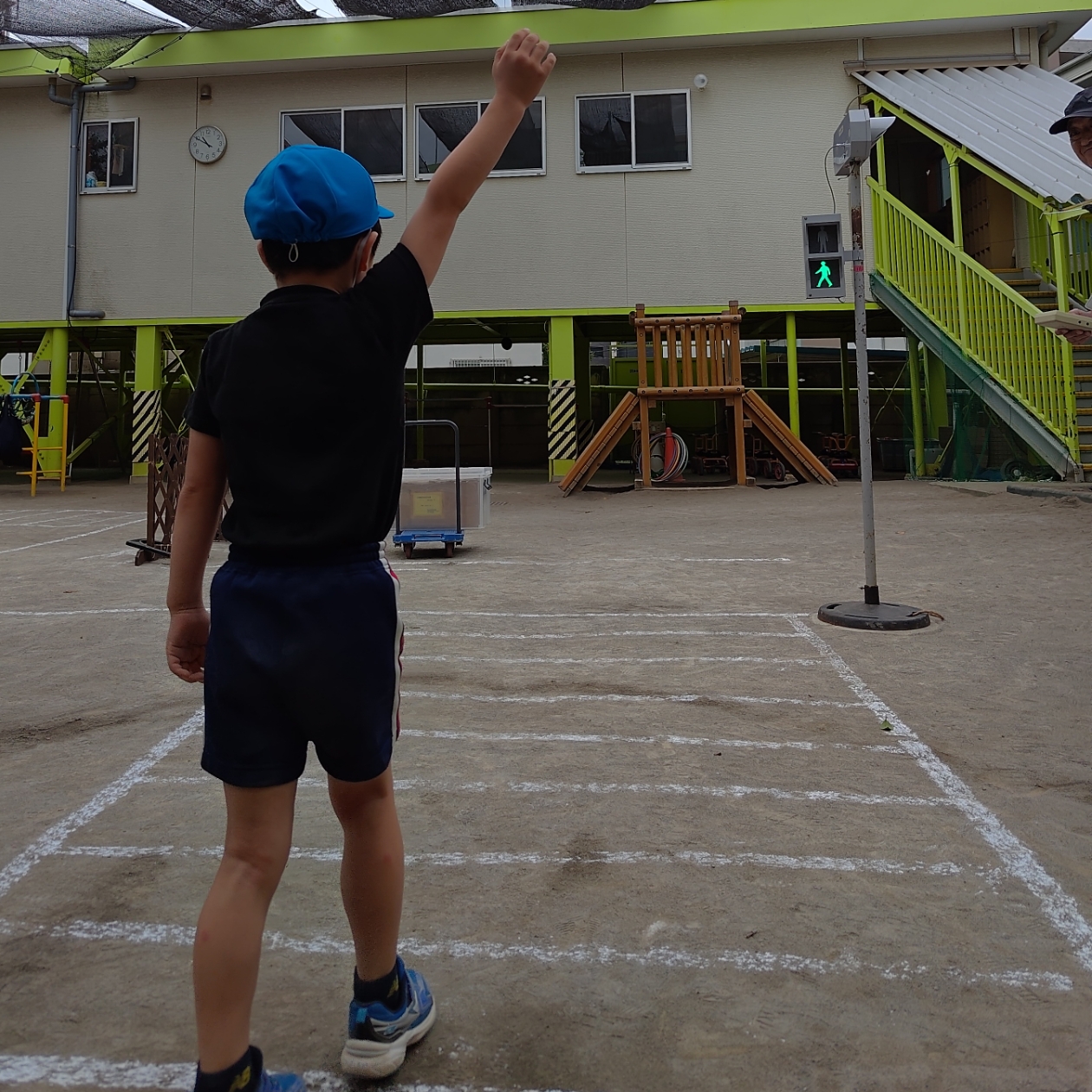 信号機の色の意味や横断歩道の渡り方、「止まれ」標識などを学び、実際に模擬道路で歩いてみる体験もしました👣