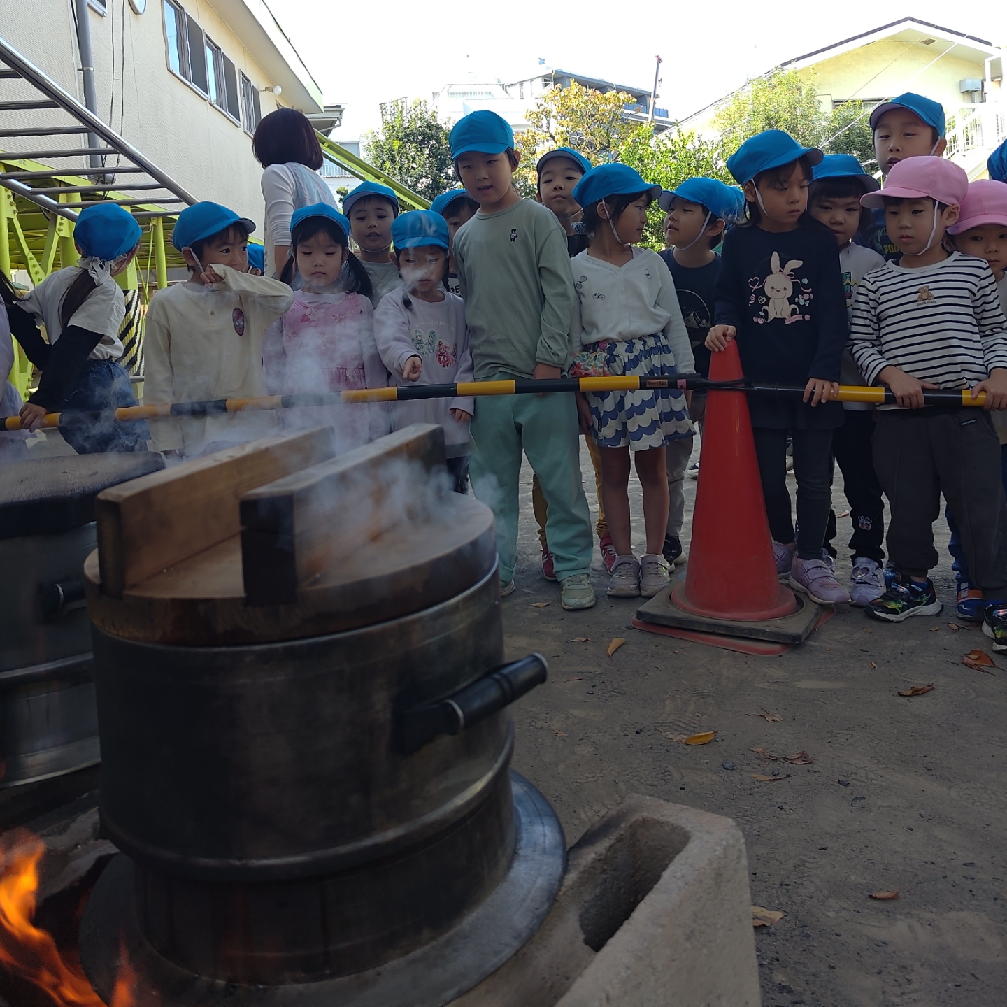 蒸し器の中でお芋がふかされていく様子を、他のクラスのお友だちも興味津々で見学✨