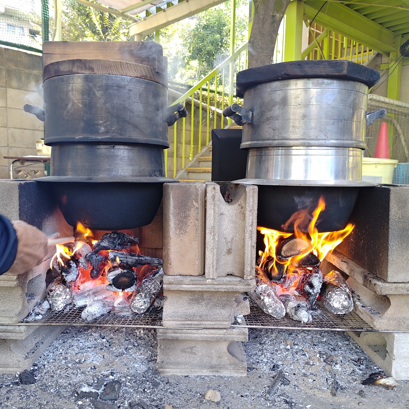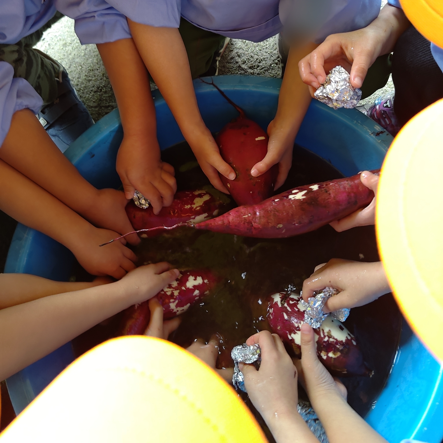 年中クラスのみんなが丁寧に洗ってくれたお芋を、園庭でふかしました!