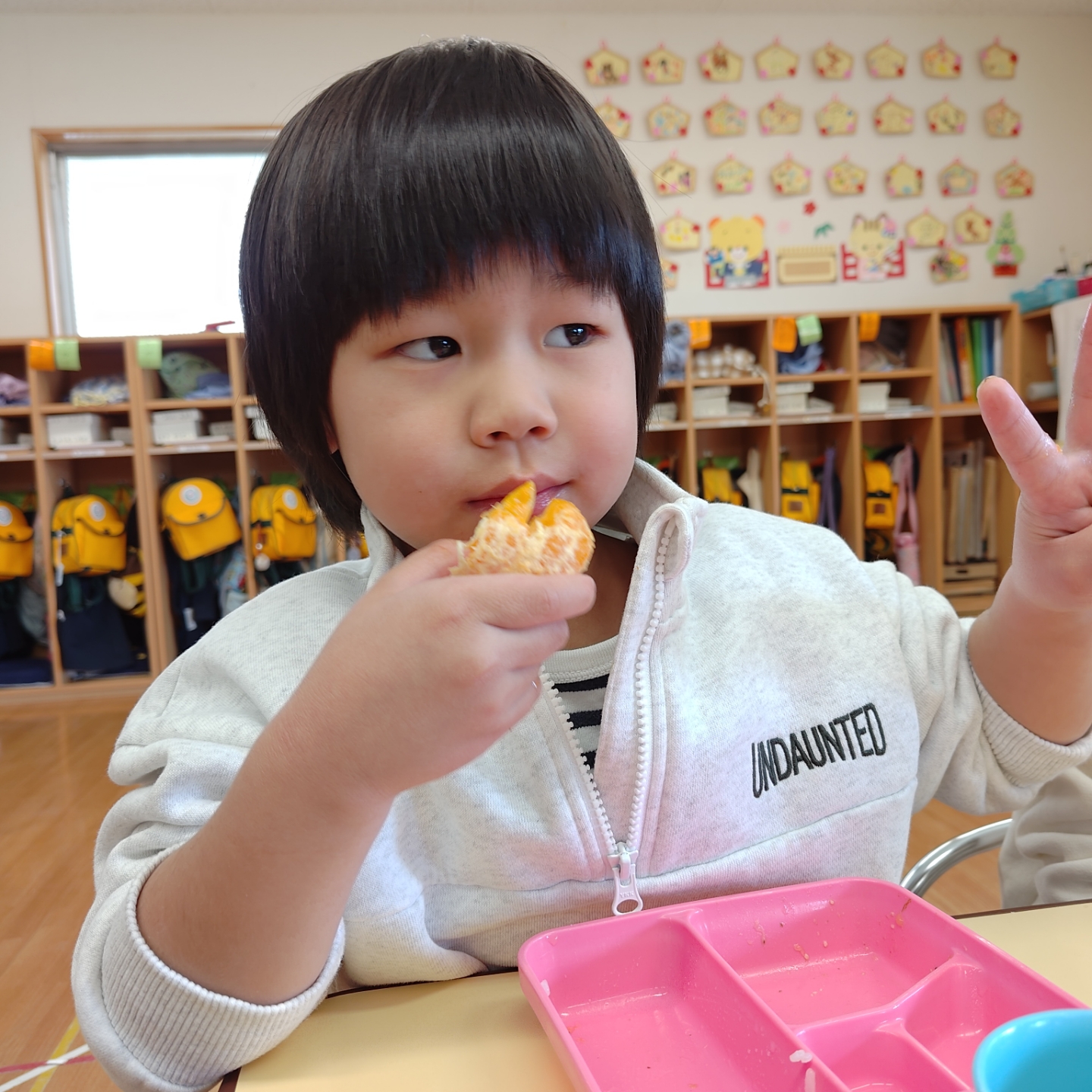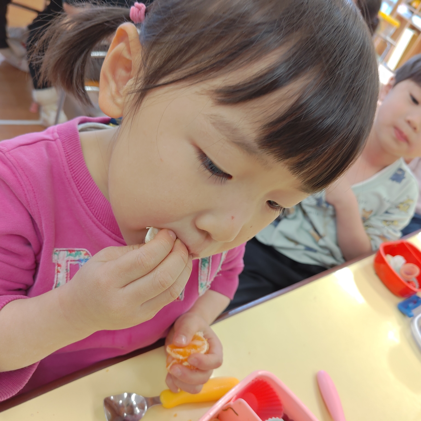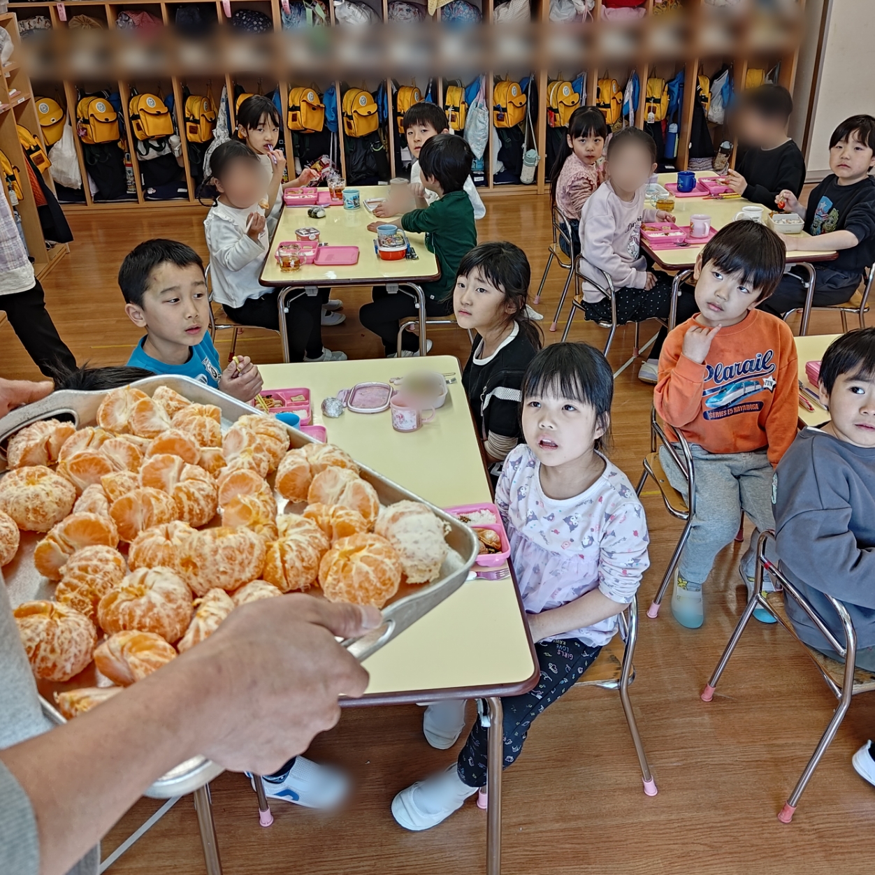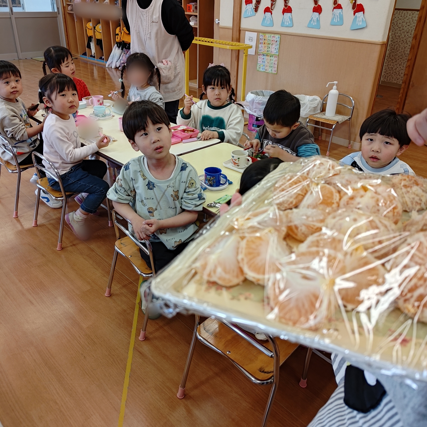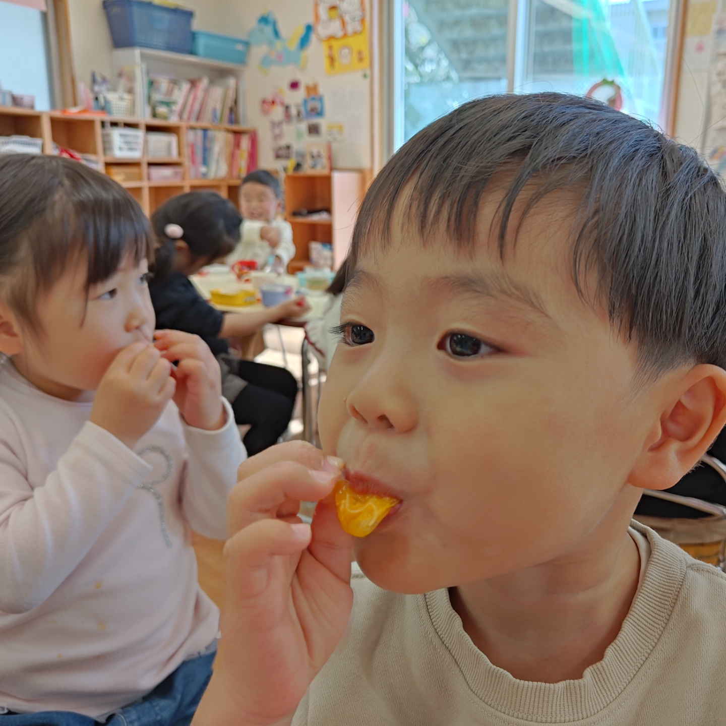 今日は、園庭で収穫したみかんを年少・年中・年長クラスのみんなでいただきました🍊