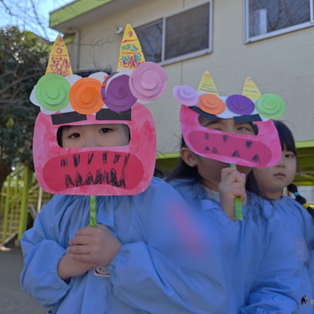 園児たちが心を込めて制作した、かわいい邪気除けのお面や道具を身につけて鬼退治👹