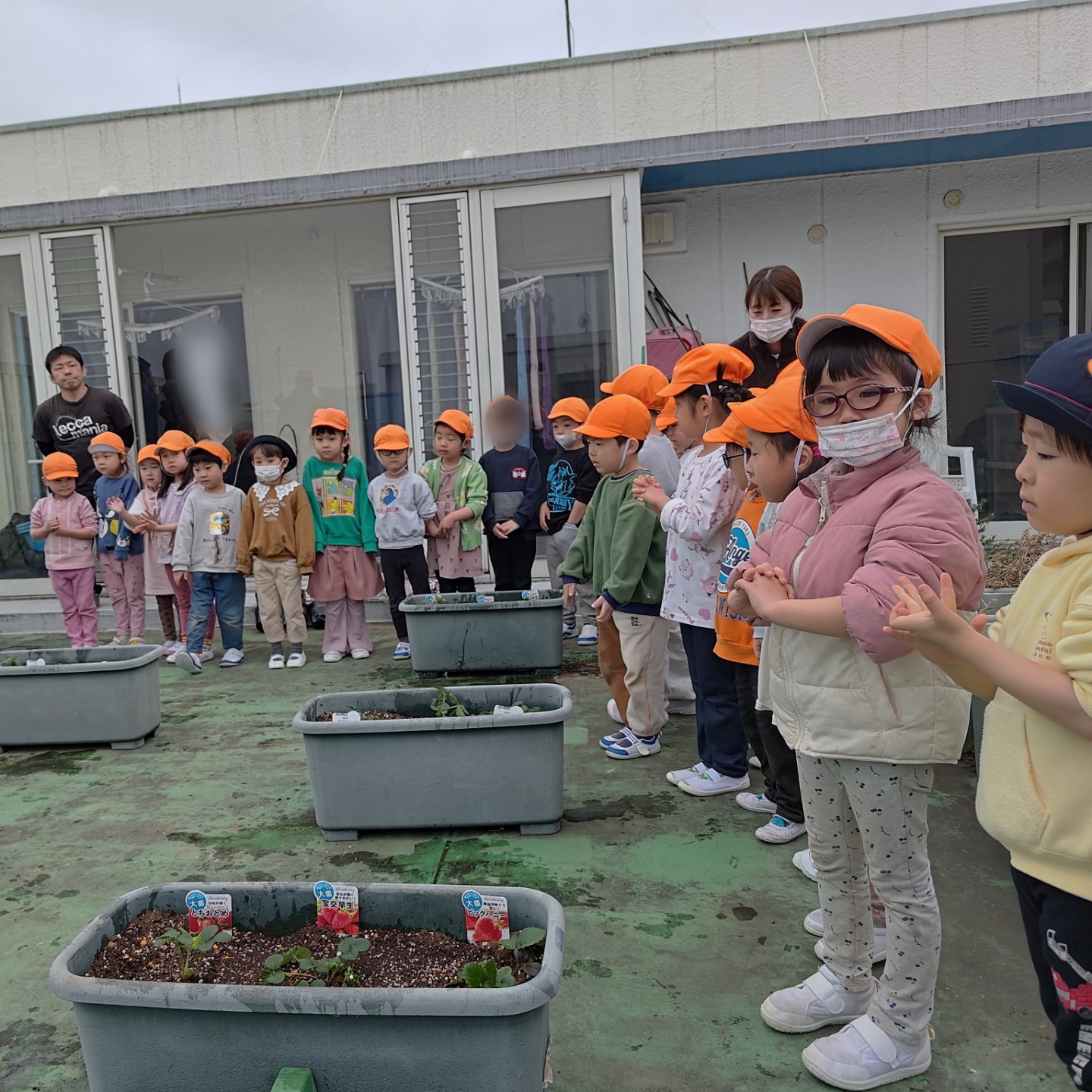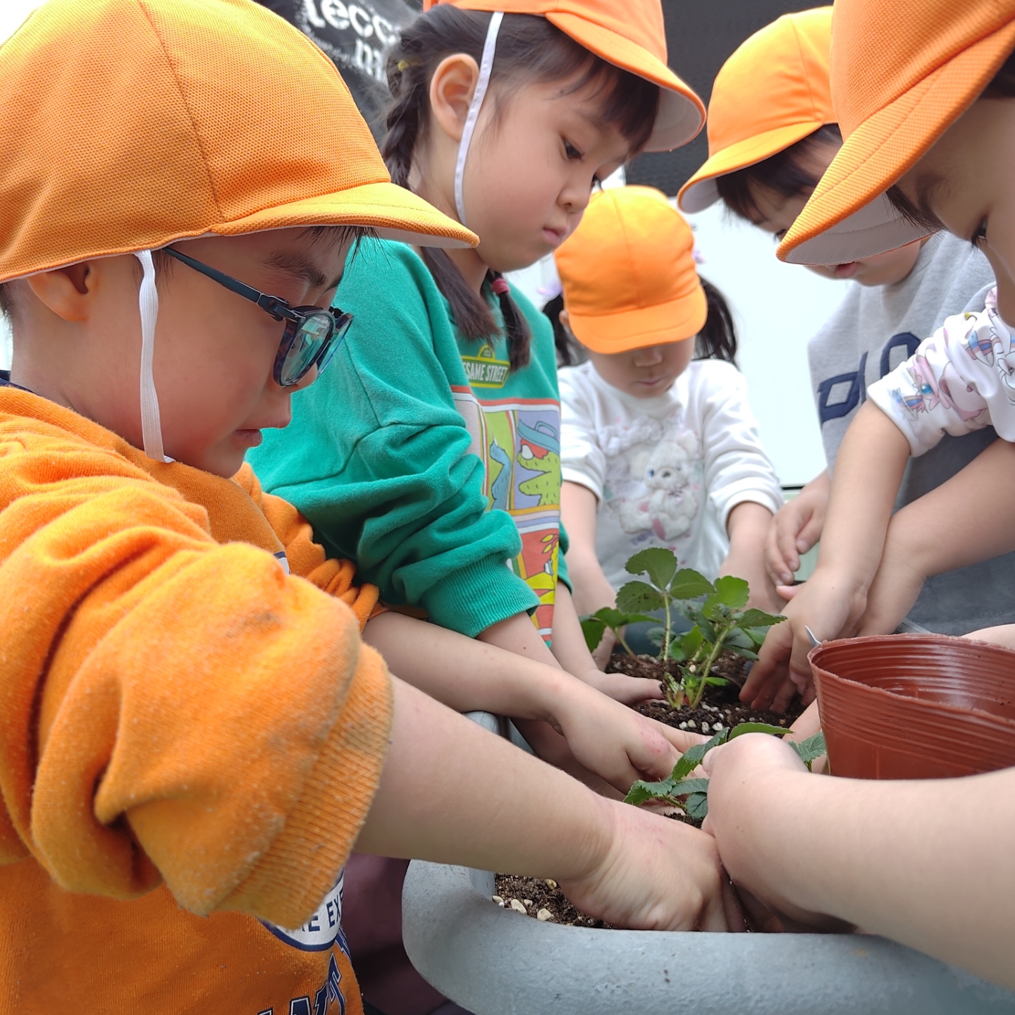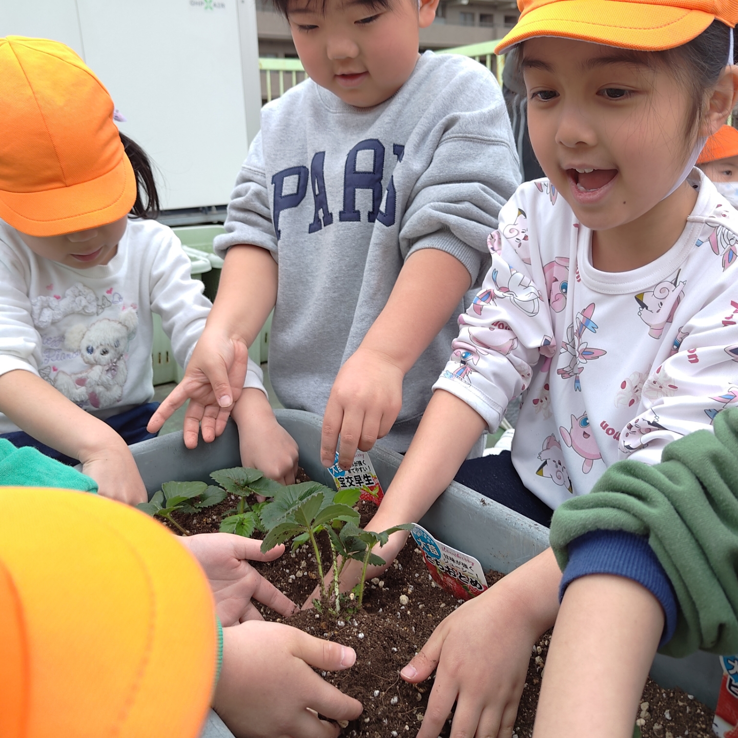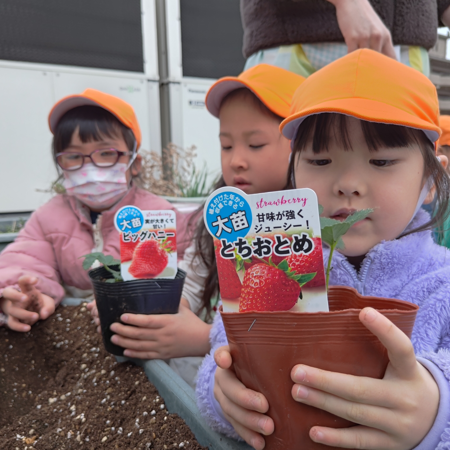 今日は、職員指導のもと、年中さくら組のみんなでいちごの苗を植えました。