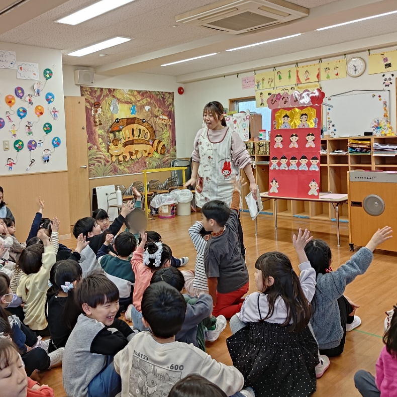 クイズ形式でお話をすると、「おだいりさま!」「三人官女!」と元気に答えてくれる子どもたち😊