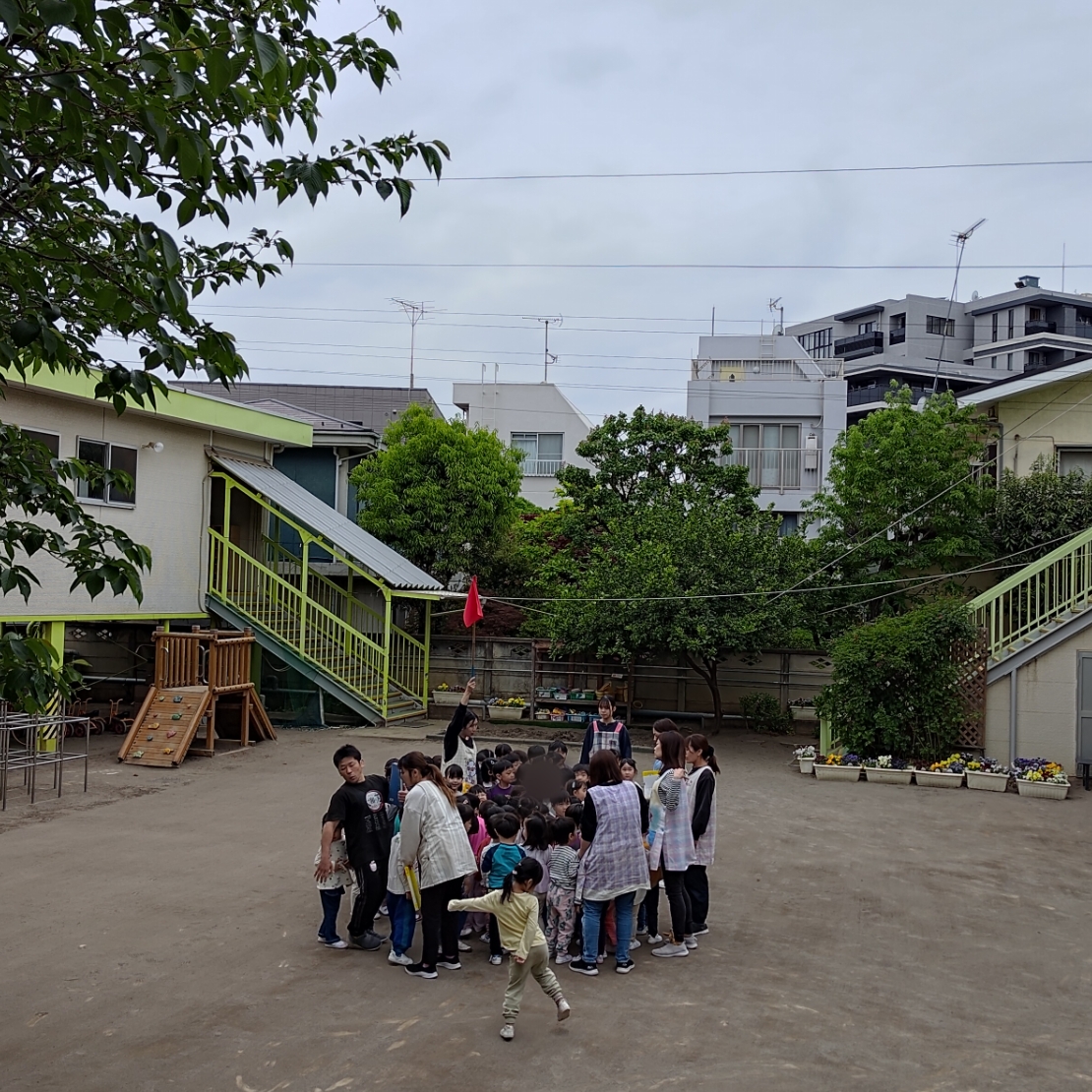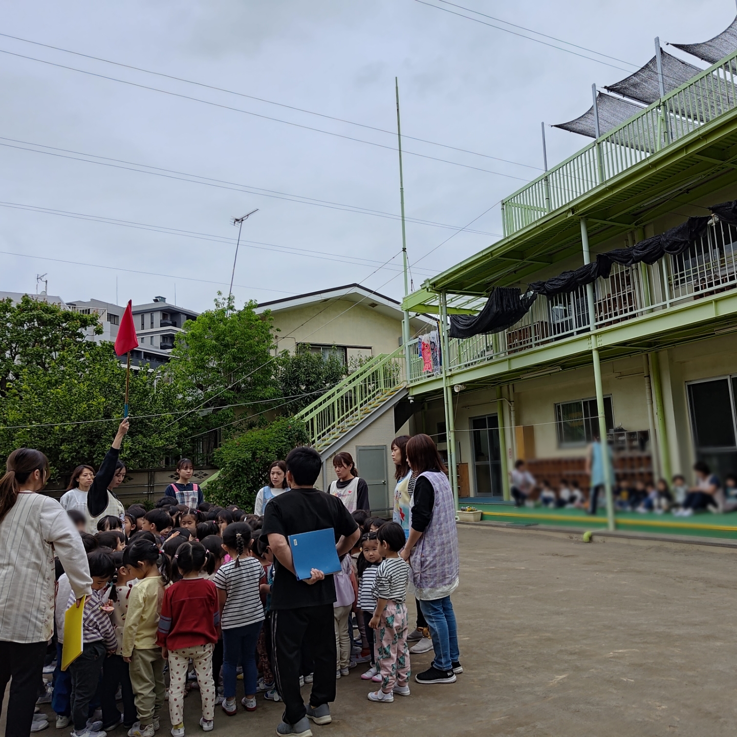 避難訓練では、職員室からの出火を想定し、放送による避難指示に従って、園庭で赤旗を持つ先生のもとへ速やかに避難しました。